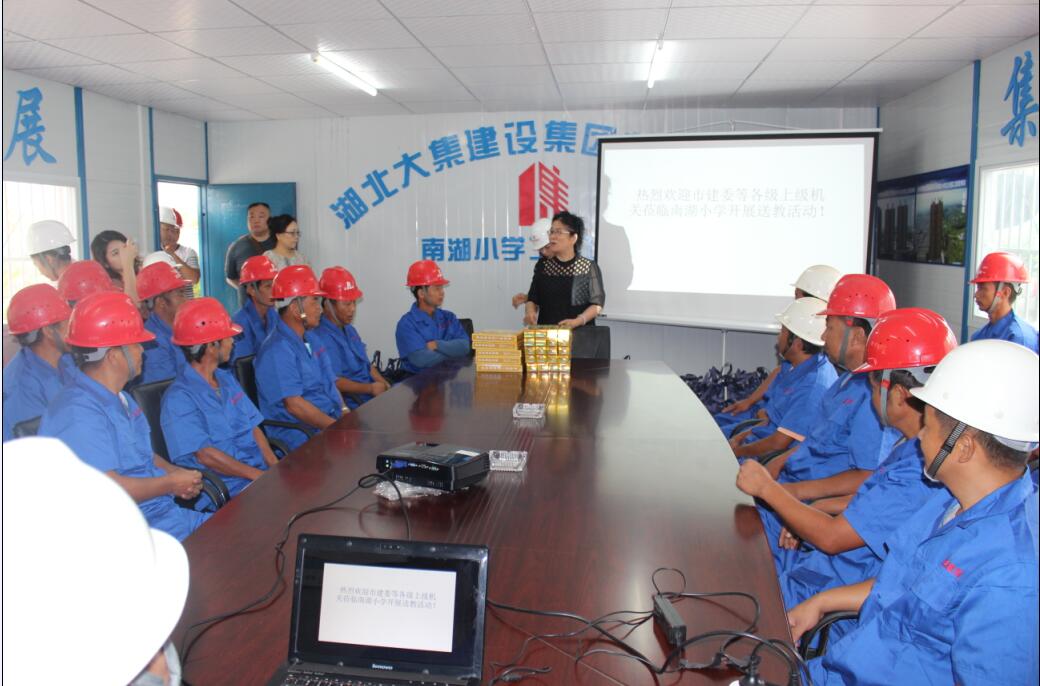 8月30日,市城建委、市人事局、市建筑工程質(zhì)量監(jiān)督站、蔡甸區(qū)監(jiān)管站一行領(lǐng)導蒞臨集團南湖小學項目開展送教活動,現(xiàn)場向工人發(fā)放保溫杯,毛巾、球鞋、收音機等生活用品和文娛用品,并通過有獎問答的形式向現(xiàn)場務(wù)工人員進行了生動有趣的安全教育和法律保險知識普及,以增強農(nóng)民工的道德法制意識和安全文明施工意識,更好地適應(yīng)現(xiàn)代化城市建設(shè)的需要!活動現(xiàn)場,兩位老師親切和藹,工人積極踴躍,場面熱烈活絡(luò)!