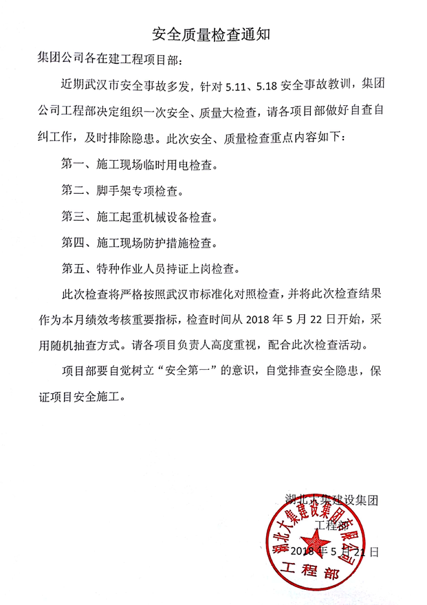 為進(jìn)一步貫徹落實集團(tuán)公司“安全生產(chǎn)重于泰山”的管理理念,5月21日,工程部下發(fā)質(zhì)量安全檢查通知,并成立質(zhì)量安全檢查組,自5月22日起隨機(jī)對集團(tuán)在建項目施工現(xiàn)場進(jìn)行安全檢查,嚴(yán)密排查施工現(xiàn)場的安全隱患,確保各項目安全施工工作順利開展。