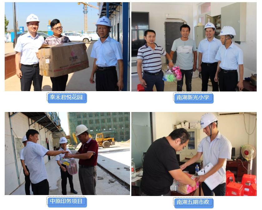 為切實(shí)做好夏季施工現(xiàn)場(chǎng)防暑降溫工作,7月19日,集團(tuán)公司開(kāi)展一線慰問(wèn)送清涼活動(dòng),前往各項(xiàng)目部發(fā)放毛巾、風(fēng)油精、人丹、十滴水等防暑降溫物資,同時(shí)要求各項(xiàng)目負(fù)責(zé)人要從以人為本、安全生產(chǎn)的高度,做好高溫防暑措施,合理安排好夏季高溫作業(yè)時(shí)間,確保項(xiàng)目一線員工安度酷暑。