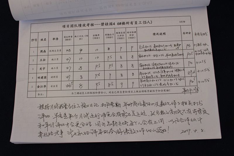 新版項目績效考核制度發(fā)布后,項目經(jīng)理周勝書立即組織自己帶領(lǐng)的項目成員對考核制度進(jìn)行集中學(xué)習(xí),讓項目人員全面了解制度內(nèi)容。此外,周經(jīng)理還深入研究考核指標(biāo)及內(nèi)容,并以其為標(biāo)準(zhǔn),結(jié)合自身項目的實際情況制定了項目團(tuán)隊績效考核表,從崗位職責(zé)、考勤打卡、施工日記、團(tuán)隊配合等方面對項目人員進(jìn)行考核,并讓項目員工嚴(yán)格執(zhí)行目標(biāo)管理卡,對當(dāng)月的工作任務(wù)進(jìn)行量化,確保項目人員工作時有目標(biāo)、有責(zé)任、有動力。