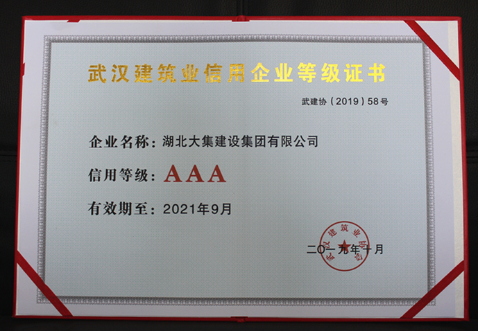 近日,經(jīng)武漢市各區(qū)建筑業(yè)協(xié)會推薦、專家評委初審、市各大站辦審核、評定領(lǐng)導(dǎo)小組和會長辦公會審定,并在武漢市公共資源交易中心和武漢建筑業(yè)協(xié)會官網(wǎng)同步公示無異議后,湖北大集建設(shè)集團(tuán)有限公司再次獲評“武漢建筑業(yè)AAA級信用企業(yè)”。
