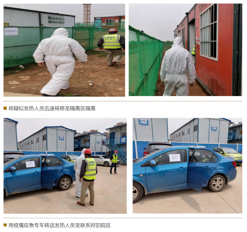 本次演練現(xiàn)場模擬一例疑似發(fā)熱患者,從被發(fā)現(xiàn)到應(yīng)急處理的全過程。演練內(nèi)容包括情況上報、項目應(yīng)急預(yù)案啟動、緊急隔離、送醫(yī)、現(xiàn)場消毒等環(huán)節(jié)。整個演練過程緊張有序、防疫物資標(biāo)準(zhǔn)齊全、保障到位,參加演練人員反應(yīng)迅速、配合默契、職責(zé)明確,達到了預(yù)期效果。