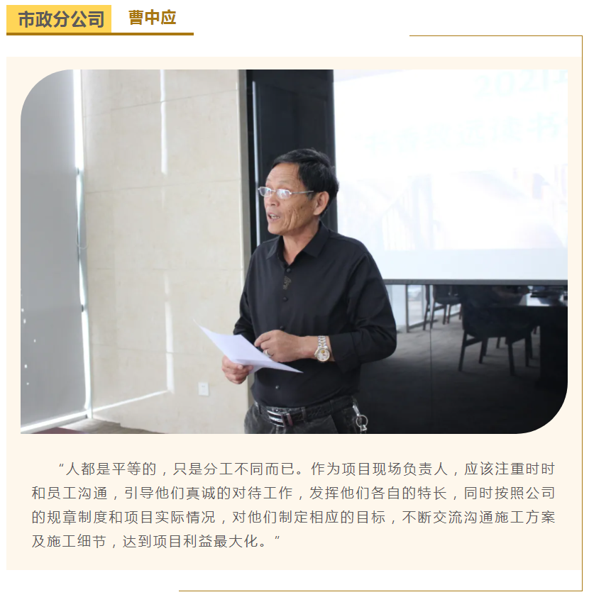 此次中高層領(lǐng)導(dǎo)共讀并分享的書籍是《麥肯錫團(tuán)隊(duì)管理法》,集團(tuán)公司七位部門負(fù)責(zé)人依次上臺(tái),結(jié)合各自的實(shí)際工作、管理經(jīng)驗(yàn)等,對(duì)書中的觀點(diǎn)進(jìn)行闡述與分析。在思想交流碰撞中,各位部門負(fù)責(zé)人進(jìn)一步加深了對(duì)團(tuán)隊(duì)管理的認(rèn)識(shí),反思了自己在部門管理中存在的問題,了解了更多的管理細(xì)節(jié),學(xué)習(xí)了更有效的管理方法,為今后更好地完成日常管理工作打下了堅(jiān)實(shí)的基礎(chǔ)。