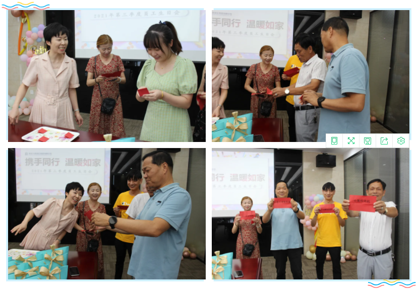 九月,秋高氣爽,碩果累累,秋日的微風(fēng)和陽光是如此的美好。成長不期而遇,生日如約而至。在精心布置的會議室里,輕快的音樂聲相隨,大屏幕上播放著美好的生日祝福,集團公司為第三季度生日的員工舉辦了小小的生日Party。氣球、生日蛋糕、禮物、精致月餅、琳瑯滿目的零食飲品,每一處溫馨的細節(jié),都承載著公司對員工的愛與關(guān)懷。