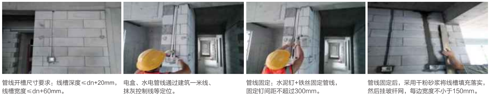 2.注意在衛(wèi)生間、廚房等有反坎部位相連的砌體排版從25cm起,但務(wù)必保證混凝土成型面標(biāo)高與砌體灰縫一致;